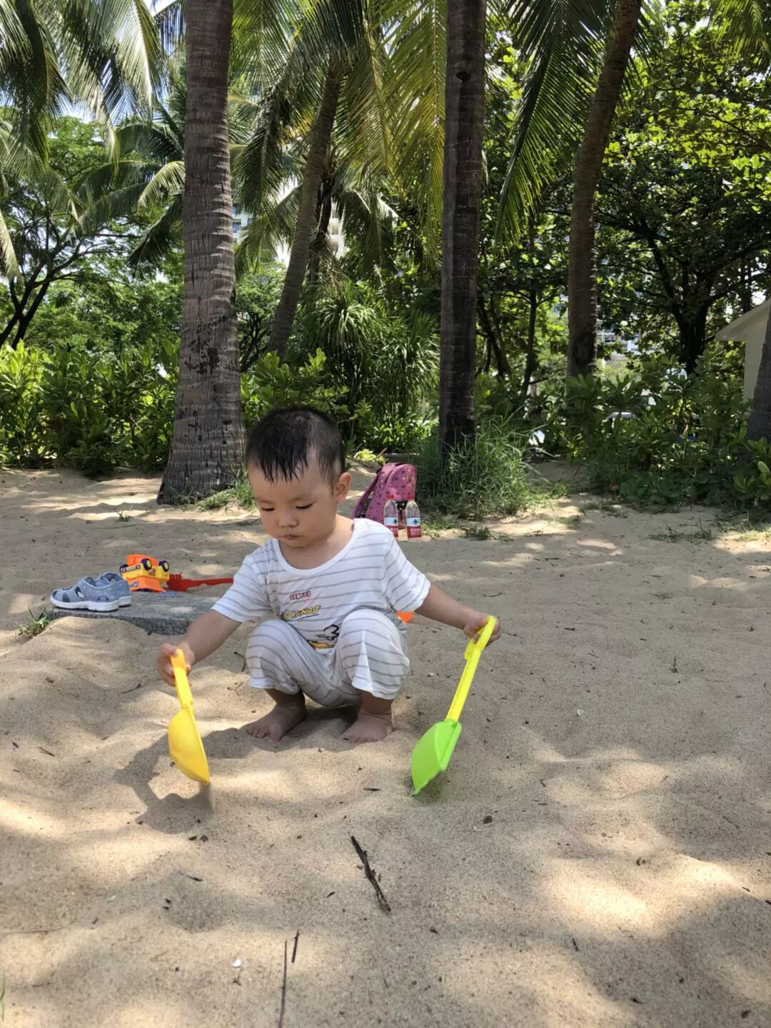他今年只有两岁,而当我们整日奔波,到处游玩的时候,他竟然是体力最充沛的家伙。在海滩上所有人都累的瘫倒在地,躲在阴凉处不敢出来的时候,他竟然仍然拿着铲子在太阳下的沙滩上疯跑,嘴里还一直兴奋地大叫“啊啊啊啊啊……”